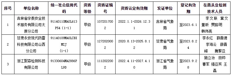 在晋从业的省外雷电防护装置检测资质单位名录(2023年第1号)